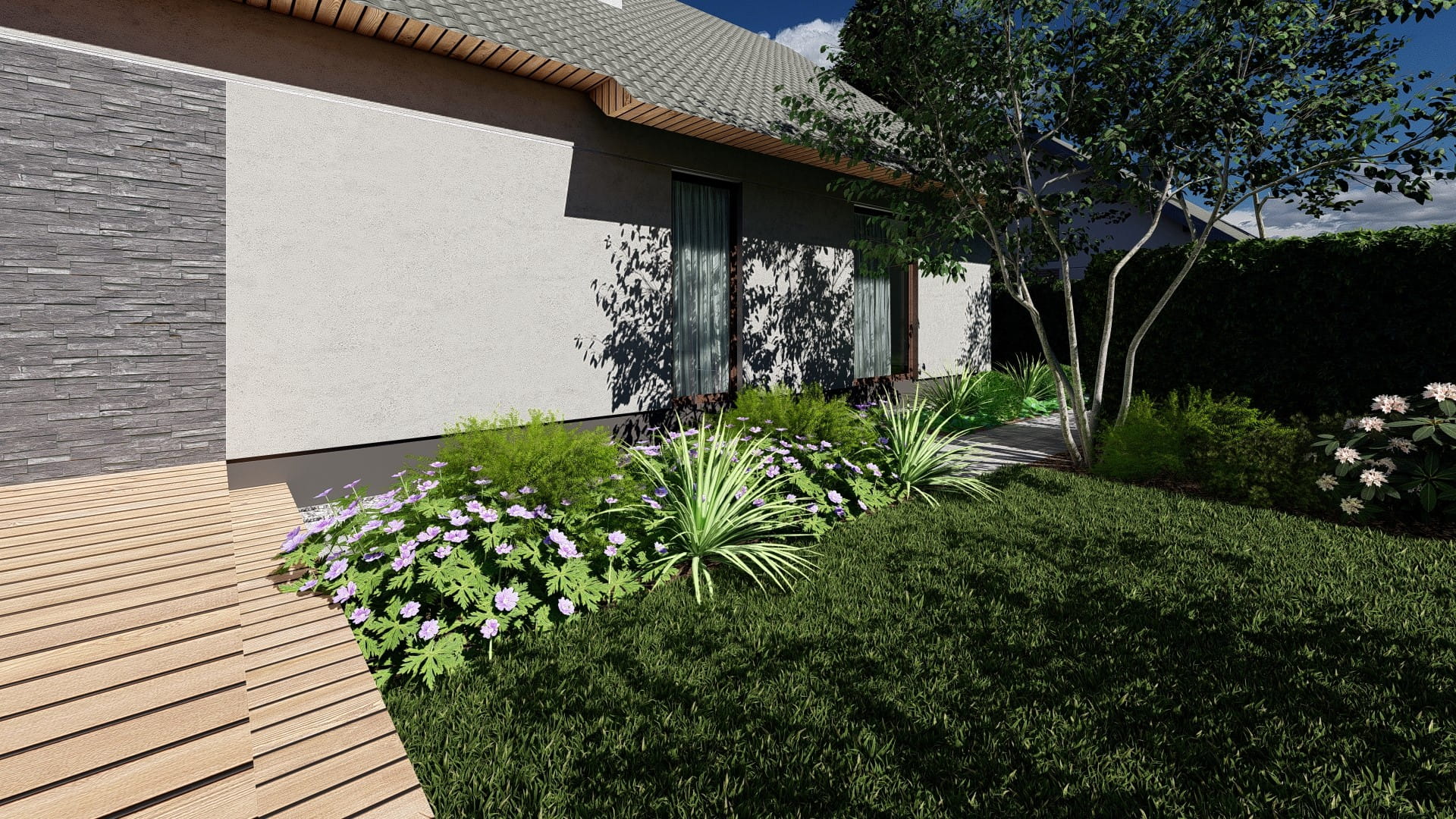 - Przedstawione zdjęcia są wizualizacją komputerową i w zależności od zakupionych roślin, sposobu wykonania prac i zastosowanych materiałów mogą różnić się w rzeczywistości.